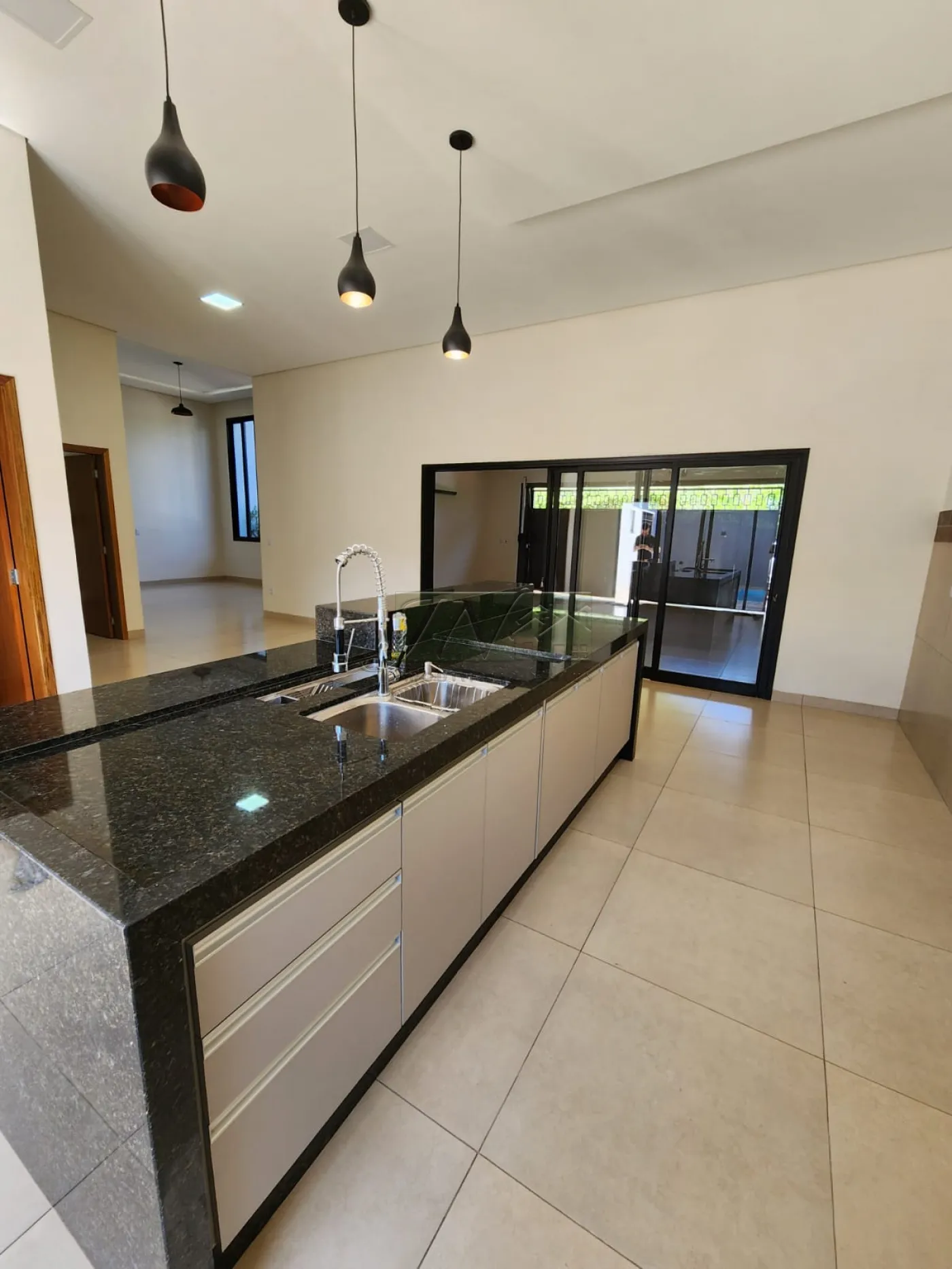 Cozinha integrada com área de lazer, com bancada e ilha com gabinete instalado;