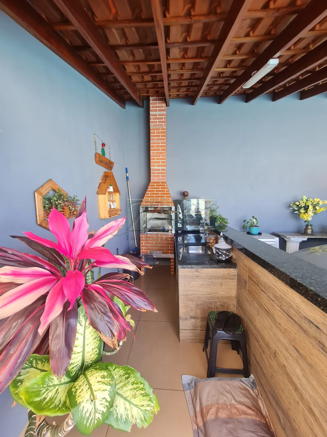 Quintal com churrasqueira e piscina;